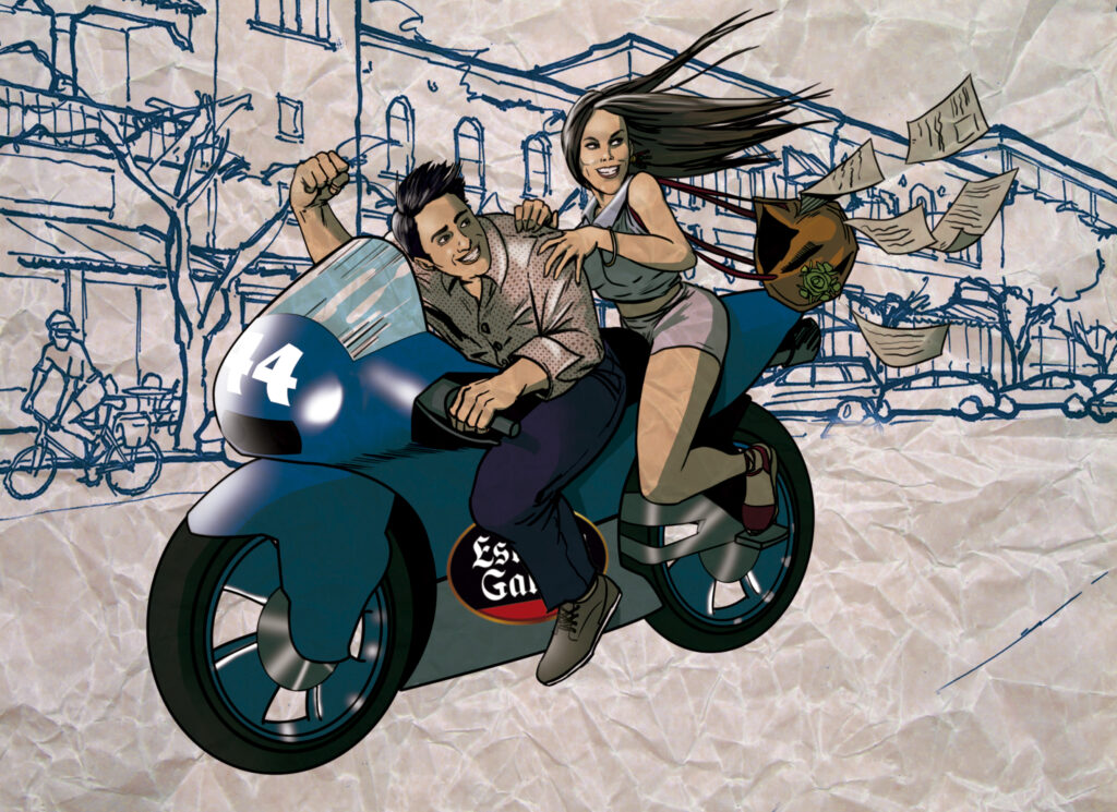 La hermana del novio tuvo una idea brillante: retratar a los futuros esposos en su salsa. Él, subido a su moto como siempre; ella, detrás, con sus papeles de profe volando por el aire, intentando no despeinarse antes de la boda. Una imagen que mezcla amor, velocidad y ese toque de caos cotidiano que hace única a cada pareja. Porque no hay nada más romántico que emprender juntos la gran aventura… ¡sin frenar!
