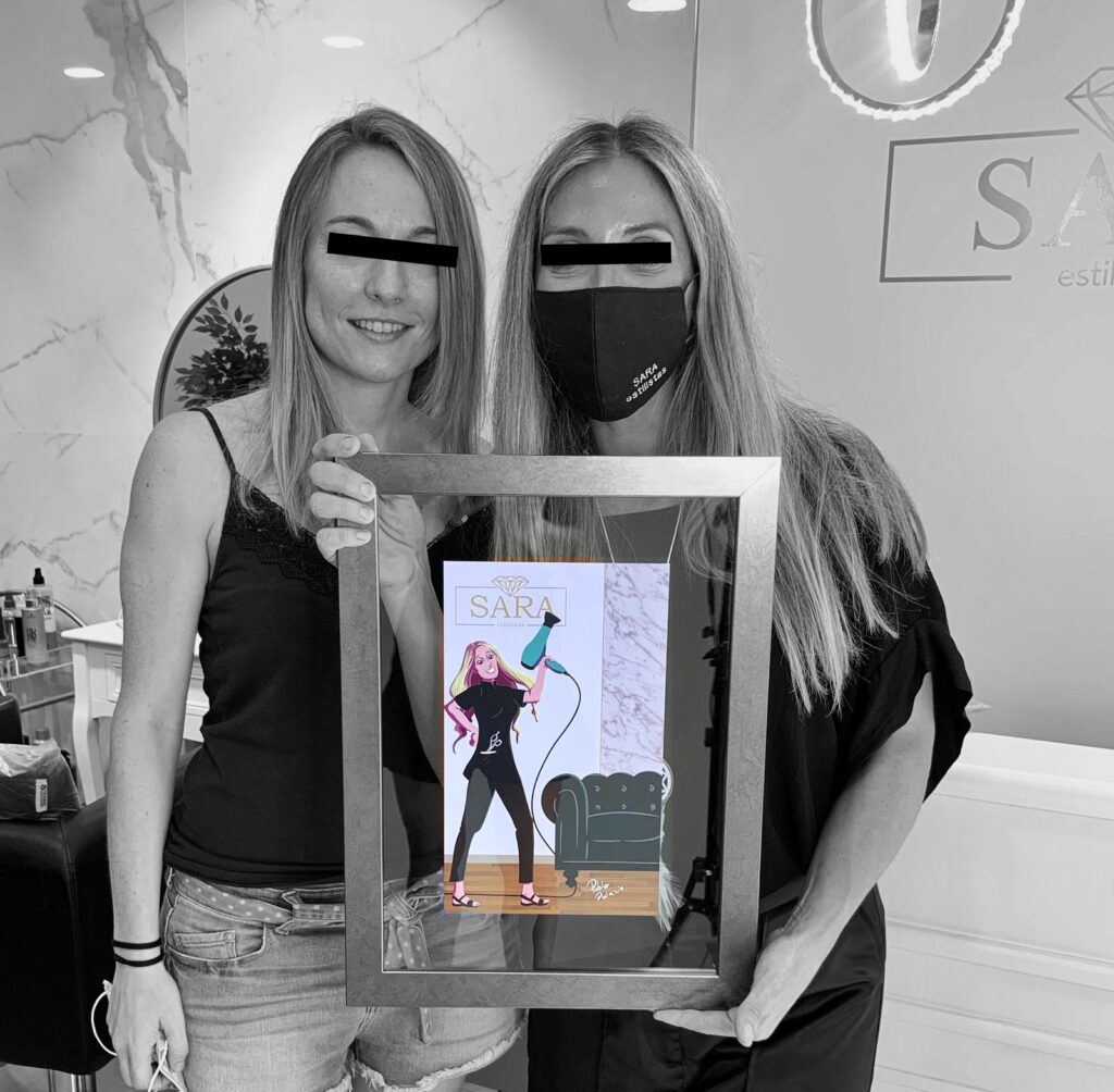 Este encargo me lo solicitó una clienta como regalo especial para su amiga, que inauguraba una nueva peluquería. Amablemente, me enviaron la foto del momento de la entrega, en la que eligieron un marco precioso para el dibujo.