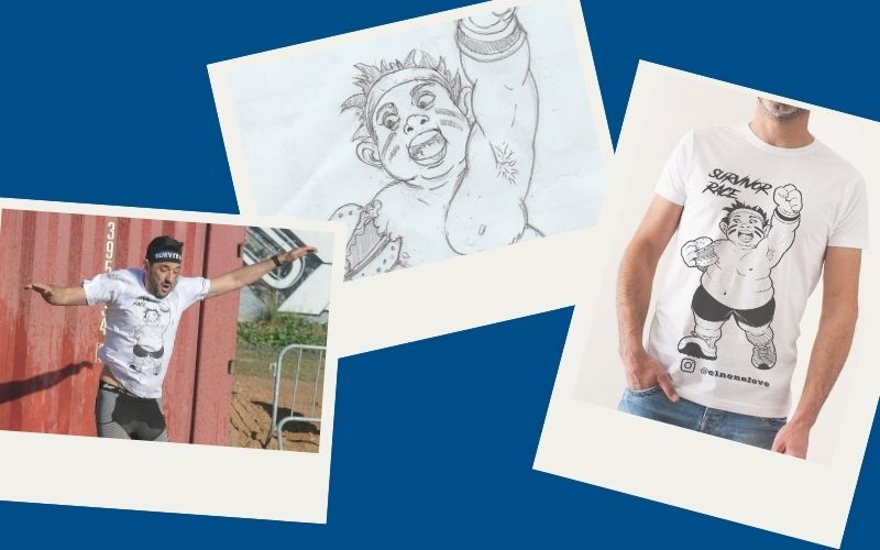 Dibujo encargado por cuatro amigos que iban a correr una carrera. Querían una imagen graciosa para sus camisetas: un personaje con sobrepeso, hamburguesa en mano, pero con toda la actitud de un atleta. Una forma genial de reírse de uno mismo y correr con estilo.