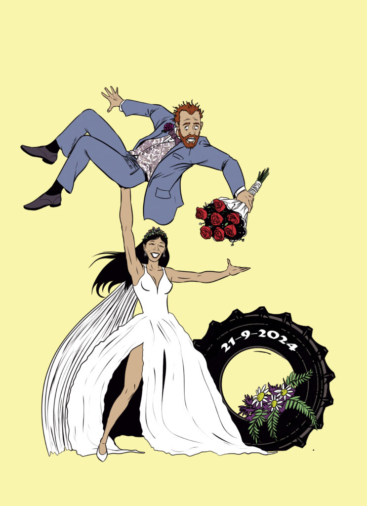 Cuando el crossfit une, ni el altar los detiene. Para este regalo de boda, retraté a la novia en modo bestia: con vestido blanco, sonrisa triunfante y levantando al flamante marido con una sola mano. Al lado, una rueda de crossfit como quien dice: “Esto es amor, pero también es fuerza bruta”. Porque en esta pareja, los votos se hacen entre repeticiones… ¡y con mucho estilo!